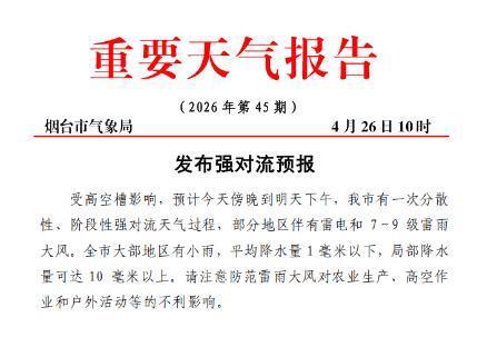 4月26日10时,烟台市气象局发布强对流预报。受高空槽影响,预计26日傍晚到27日下午,烟台市有一次分散性、阶段性强对流天气过程,部分地区伴有雷电和7~9级雷雨大风。全市大部地区有小雨,平均降水量1毫米以下,局部降水量可达10毫米以上。